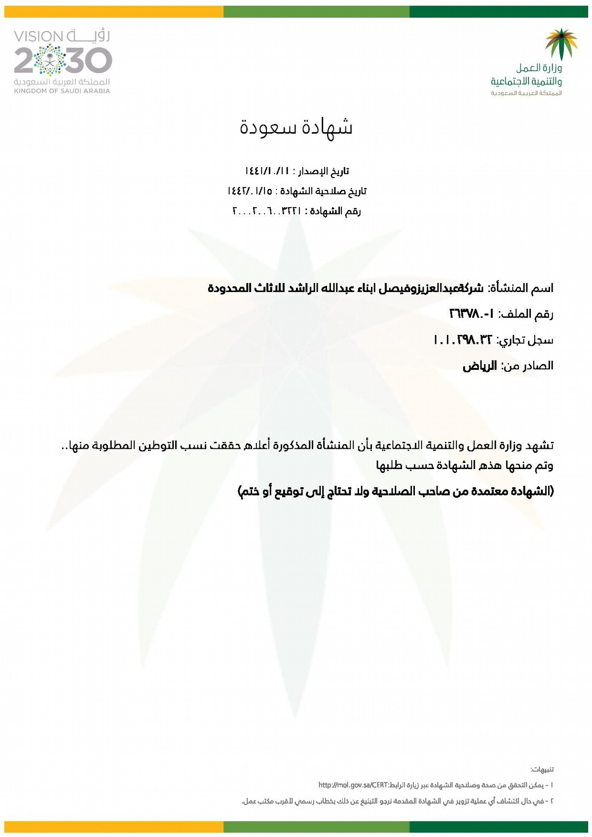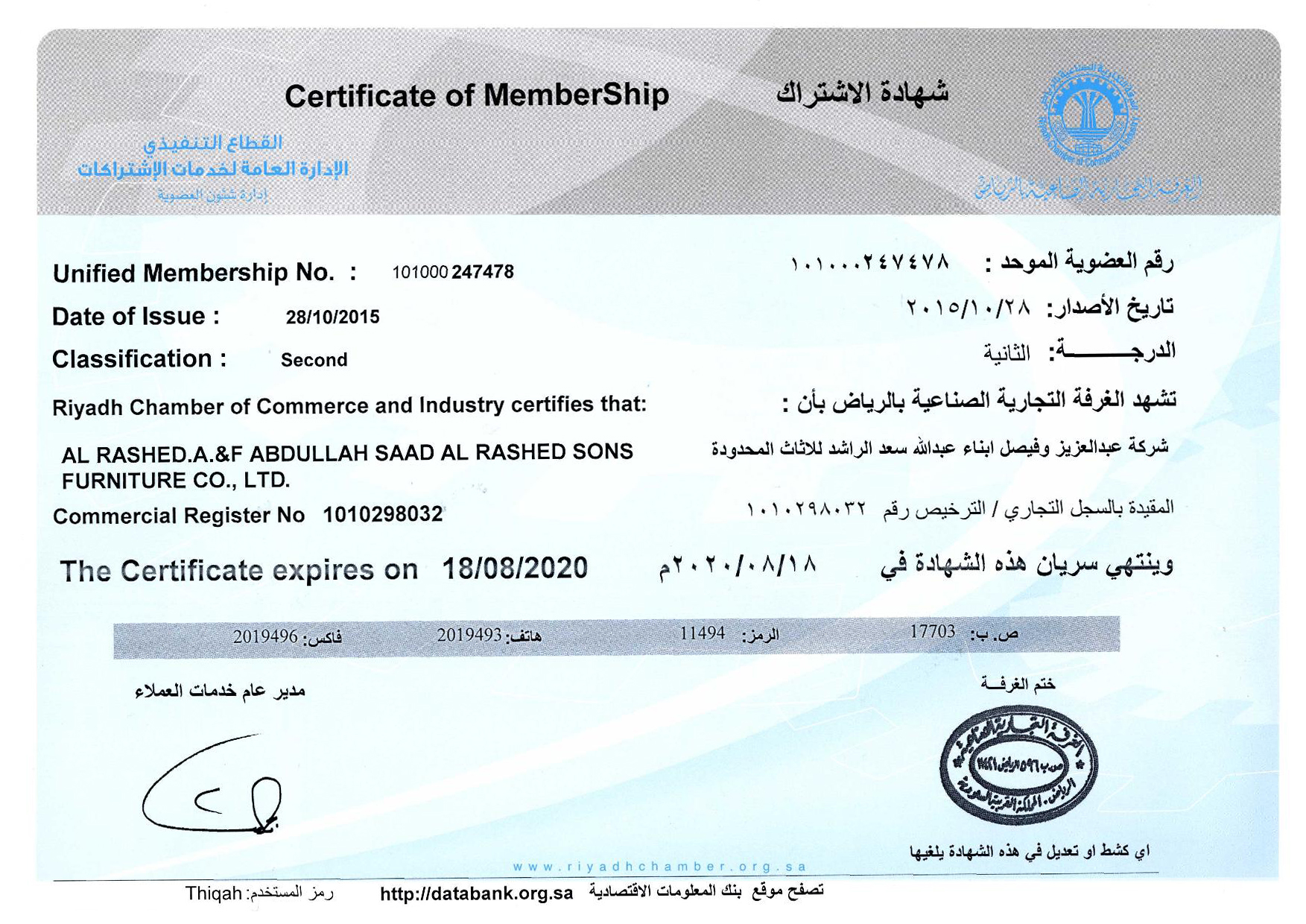 Riyadh Chamber of Commerce Membership certificate