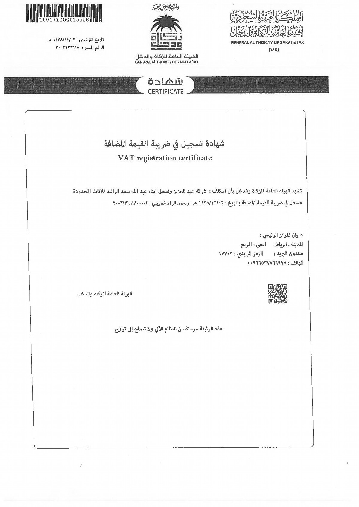 VAT registration certificate